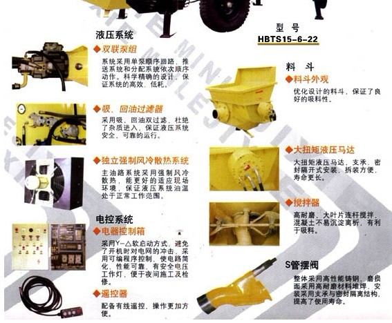 細石混凝土泵配件有:主油缸、砼缸、三相異步電機、主油泵、料斗、S管、電配柜、手動油泵、活塞;00#鋰基脂;常用的電器配件(按鈕天關、行程天關、斷路器、接線端子、變壓器等)、液壓液管;46#液壓油;眼睛板、切割環(huán)(當設備打到5000方以上就可以備了)等等。