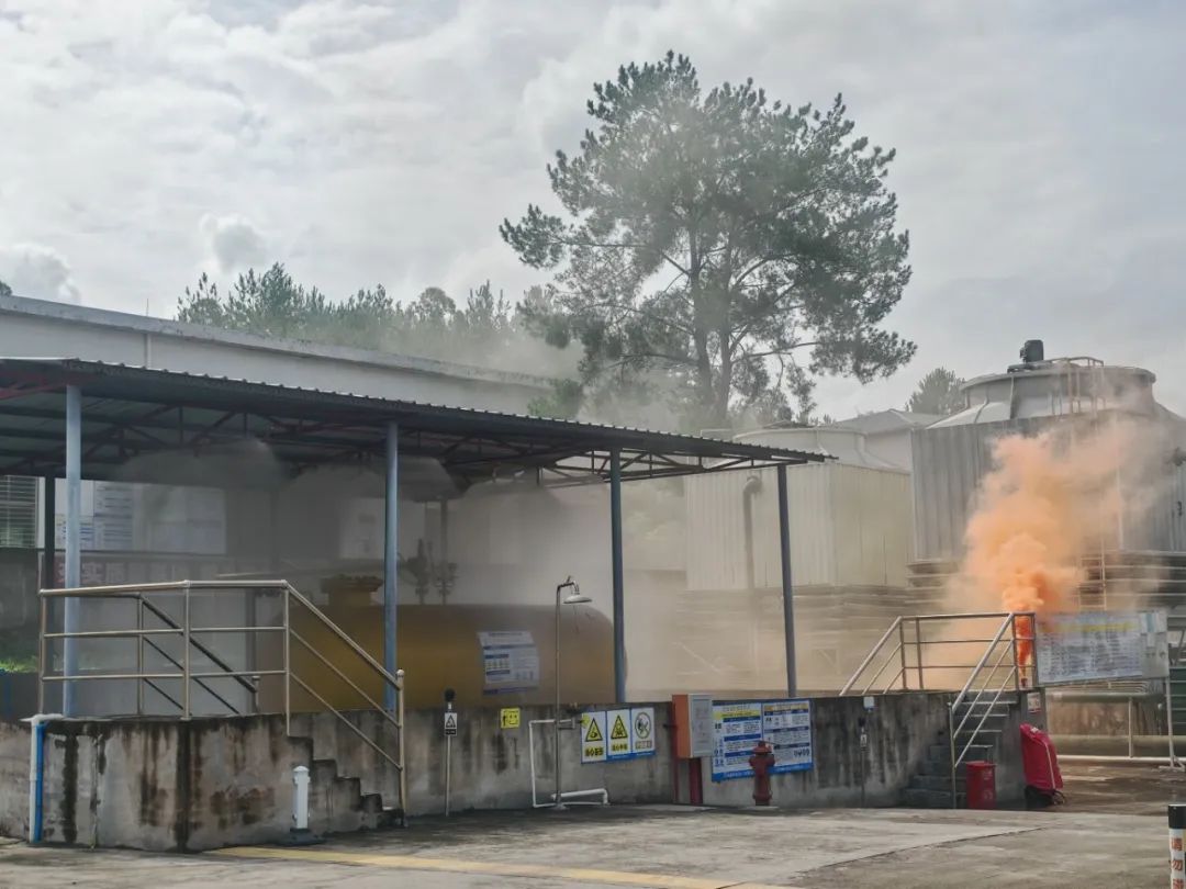 本次演練模擬化工廠液氨儲罐出料管道破裂,導致大量液氨發(fā)生泄漏并引發(fā)火災。上午9時30分,中控室操作員在值班室突然聽到氣體報警器發(fā)生報警聲,立即查看視頻監(jiān)控,發(fā)現(xiàn)液氨儲罐出料管道冒出大量白煙,且觸發(fā)連鎖噴淋裝置,意識到液氨發(fā)生泄漏。情況非常緊急,該操作員立即上報公司應急總指揮。